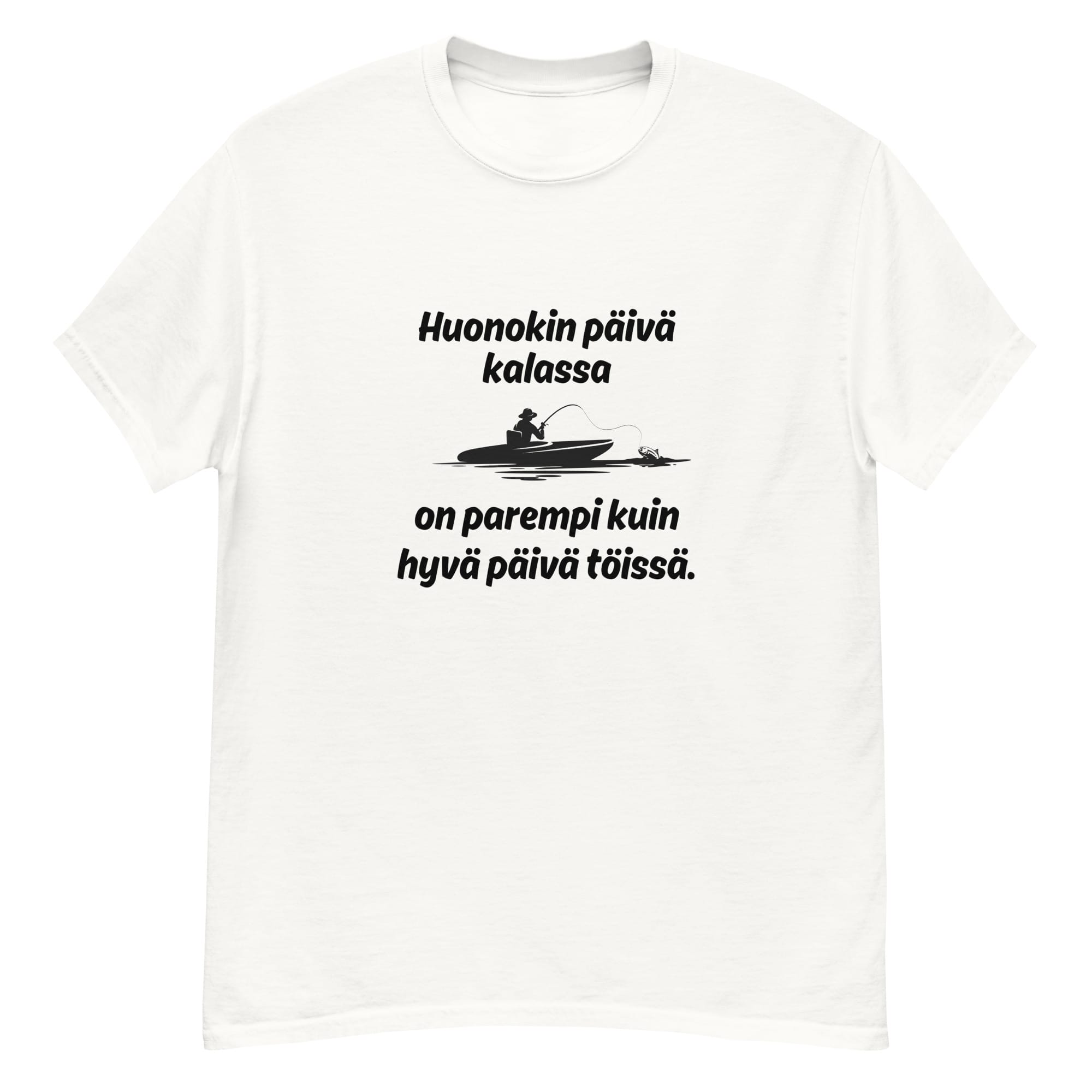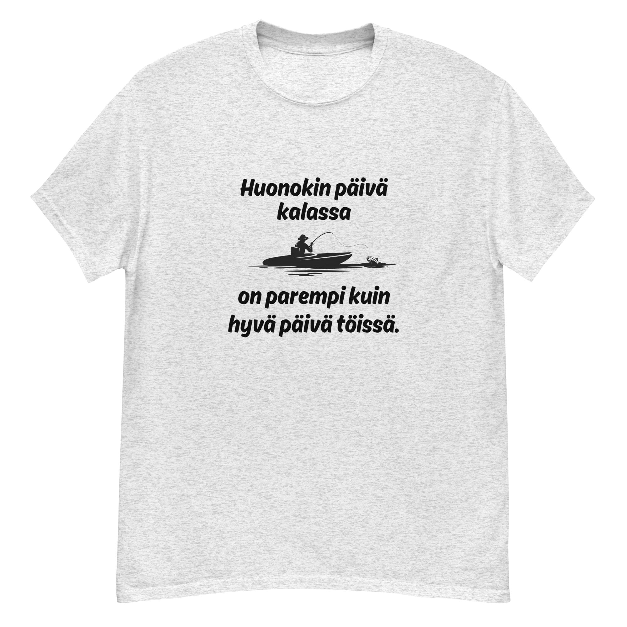”Huonokin päivä kalassa” -teksti tuo esiin sen, että vaikka kalastus ei aina mene suunnitelmien mukaan, se on silti harrastus, joka tarjoaa irtiottoa arjen kiireistä. Tämä huumori t-paita sopii jokaiselle, joka nauttii luonnon rauhasta ja siitä tunteesta, kun olet vesillä, vapaa kädessä, ja maailma ympärilläsi hiljenee. Se muistuttaa, että vaikka kaikki ei aina suju täydellisesti, pelkkä hetki vesistön äärellä voi ladata akut ja tehdä huonostakin päivästä paremman.