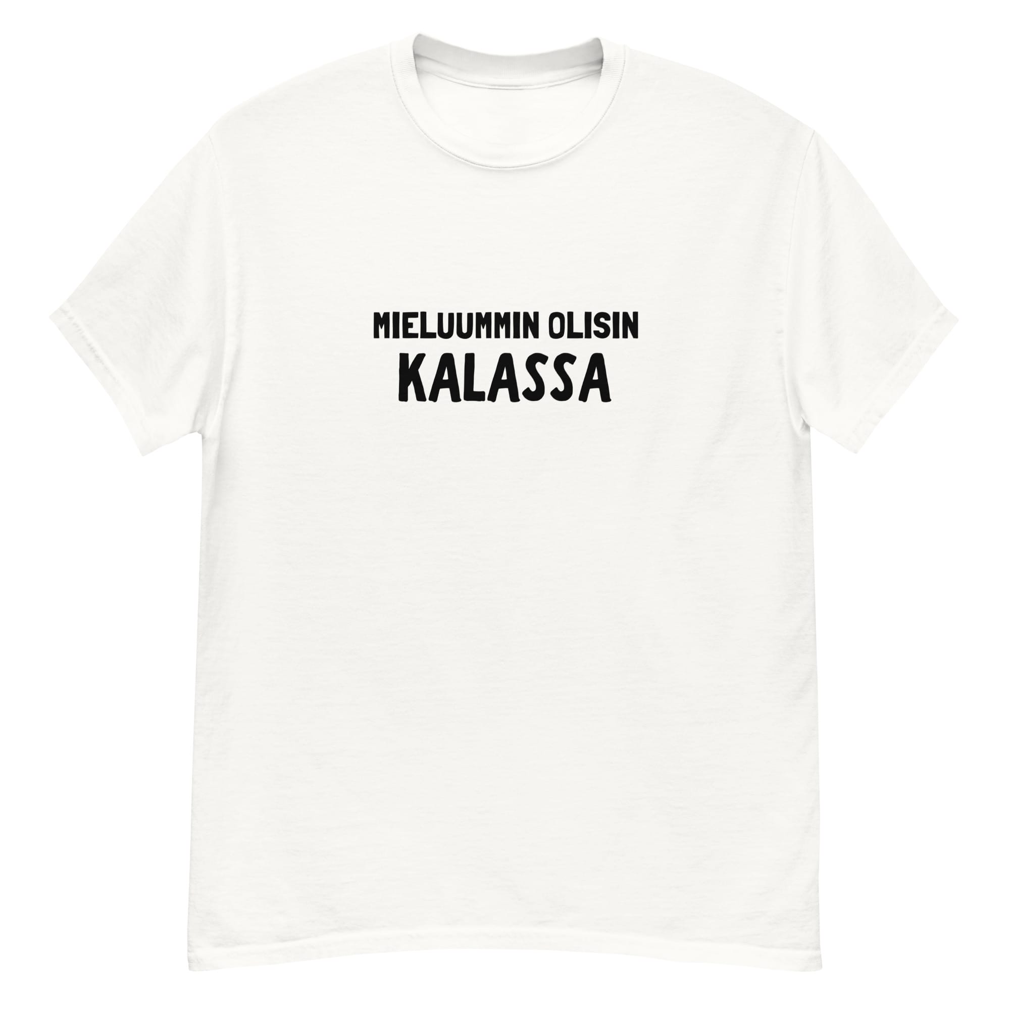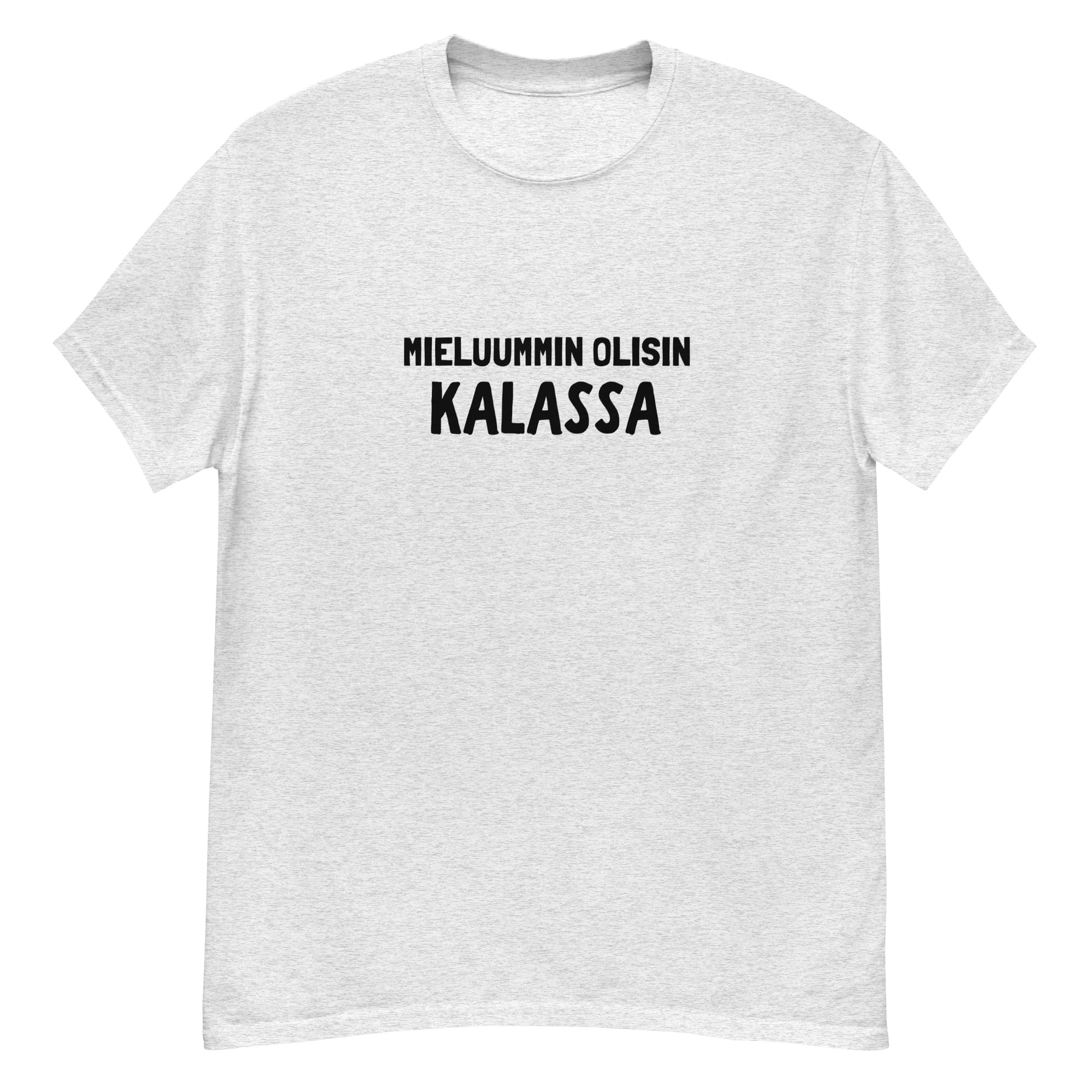 Mieluummin olisin kalassa | T-paita info & kokotaulukko