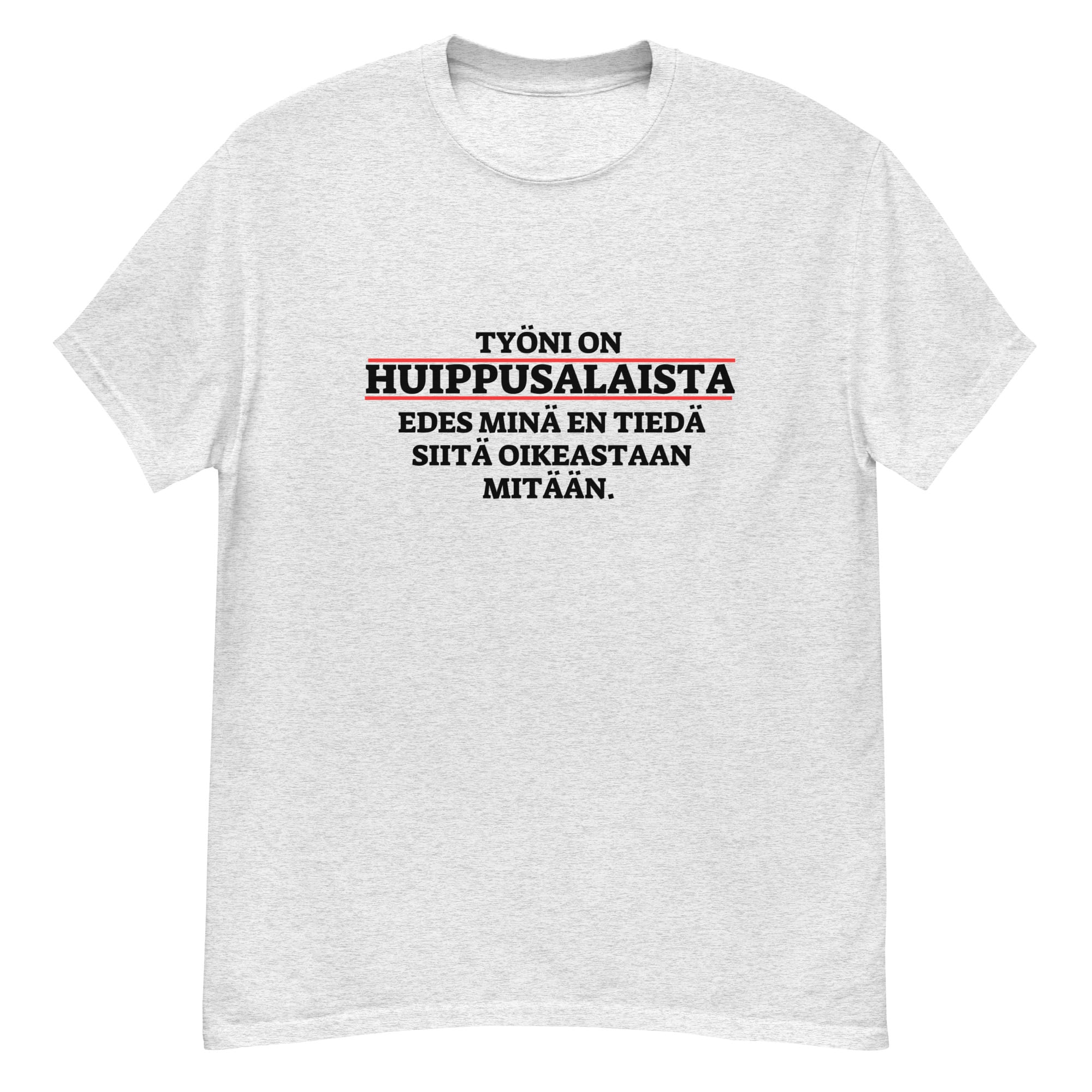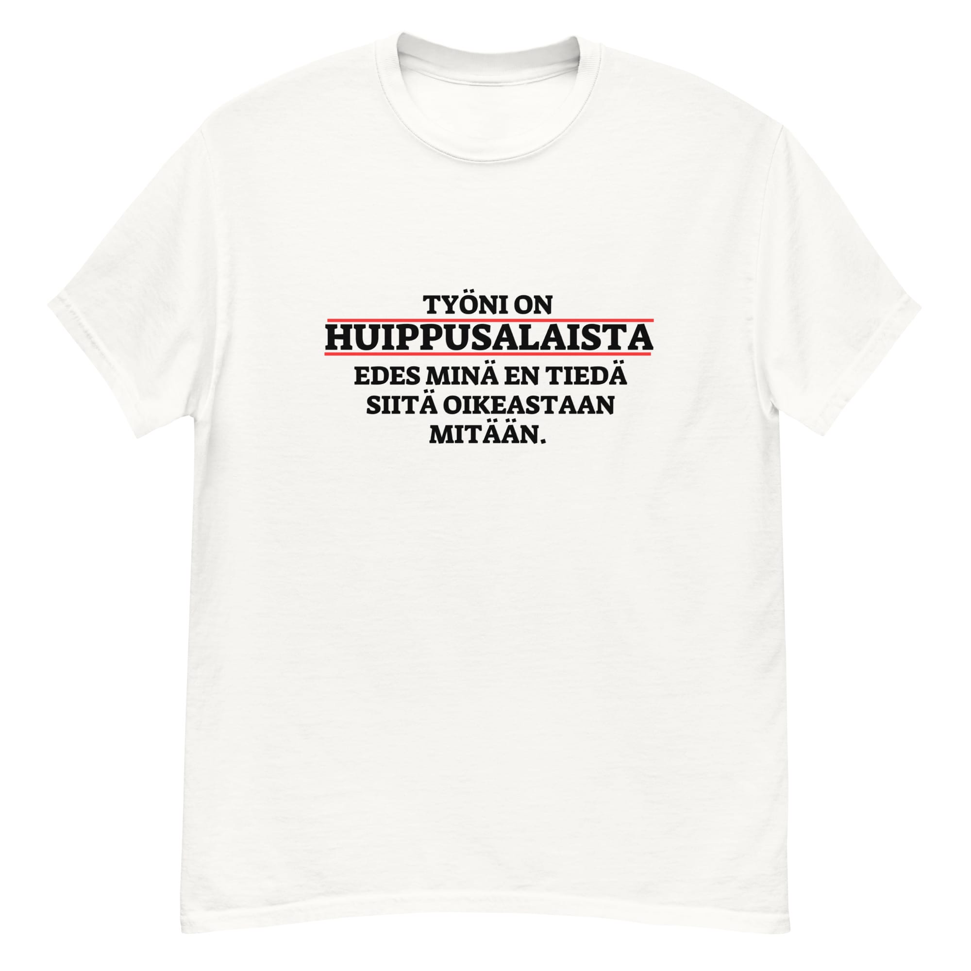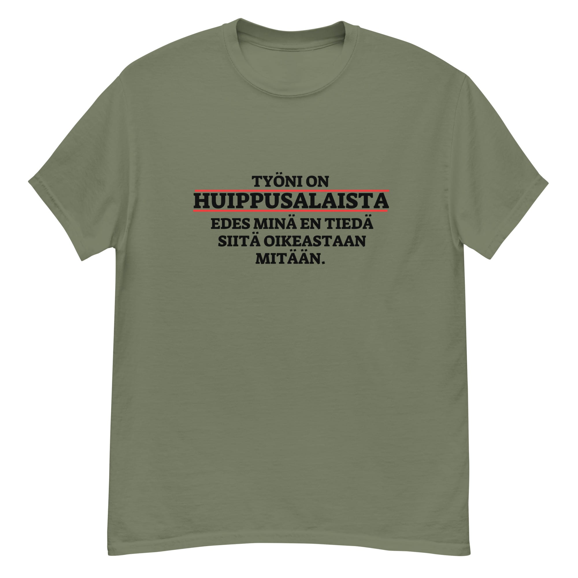 ”Työni on huippusalaista. Edes minä en tiedä siitä oikeastaan mitään” -t-paita on täydellinen valinta kaikille, jotka työskentelevät mysteerin ympäröimänä – tai ainakin niin mysteerisessä työssä, että joskus oma rooli ja tehtävät jäävät hieman hämärän peittoon. Tämä huumori t-paita on täynnä huumoria ja itseironiaa, ja se on omistettu kaikille niille, jotka osaavat nauraa työelämän kommelluksille ja arjen haasteille. Olipa kyseessä työpaikan jatkuva kiire tai välillä epäselvä työnkuva, tämä paita antaa ymmärtää, että kaikki on täysin hallinnassa – ainakin jollain tasolla!